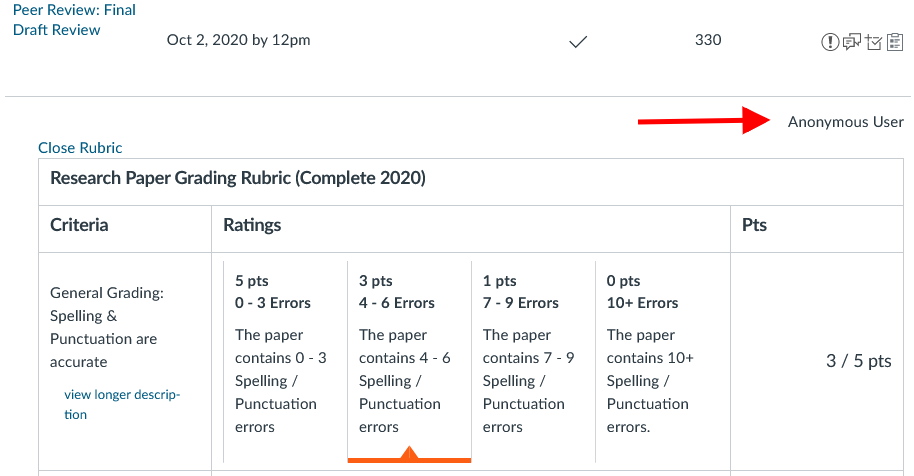 Step 3: Identify the rubric copy you wish to review by finding the reviewer's name. If peer reviews were completed anonymously, this will display as Anonymous User.