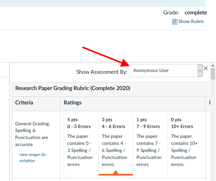 Step 4: Select the copy of the rubric to view by picking a name from the dropdown list. If peer reviews were completed anonymously, the name(s) will display as Anonymous User. If this dropdown menu does not appear, then you have not yet received peer review feedback.