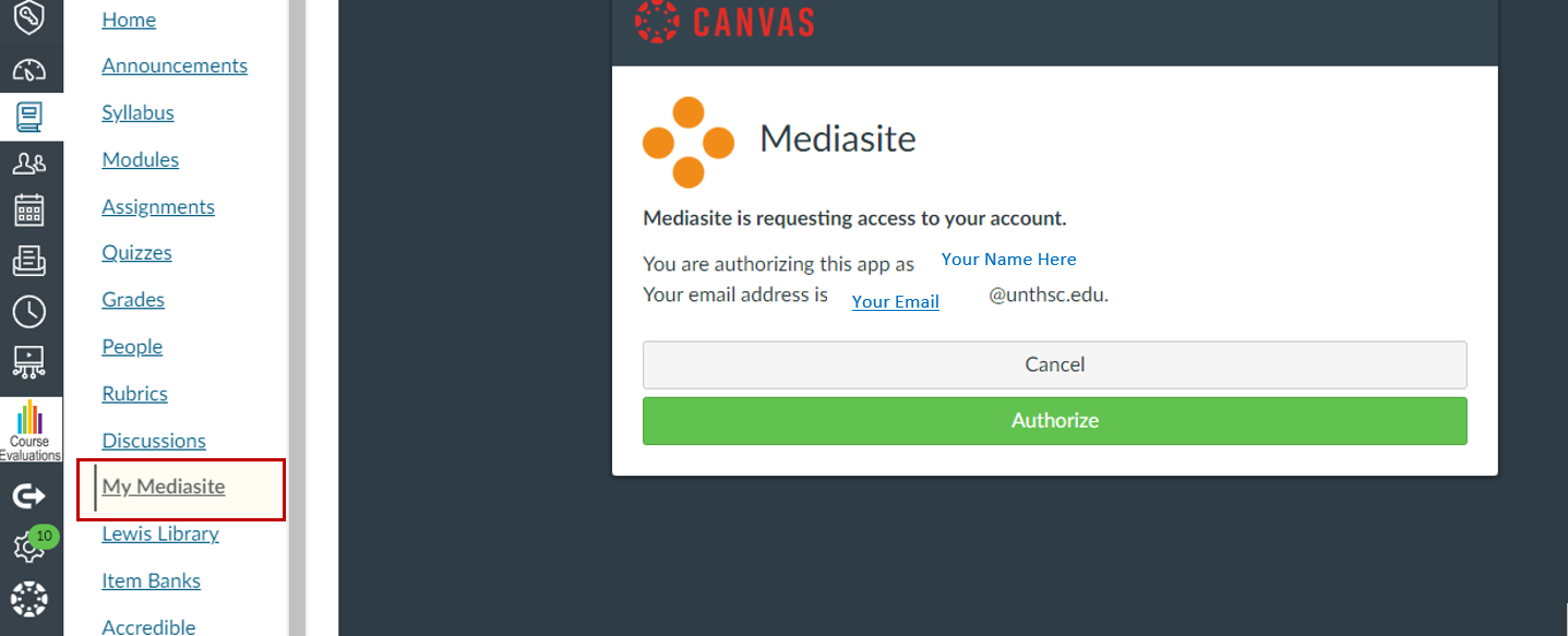 On the left side of your Canvas Interface in the Navigation Channel, open "My Mediasite" and "authorize" it, if needed.
