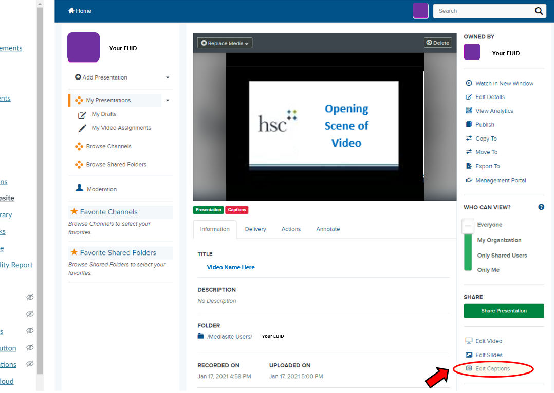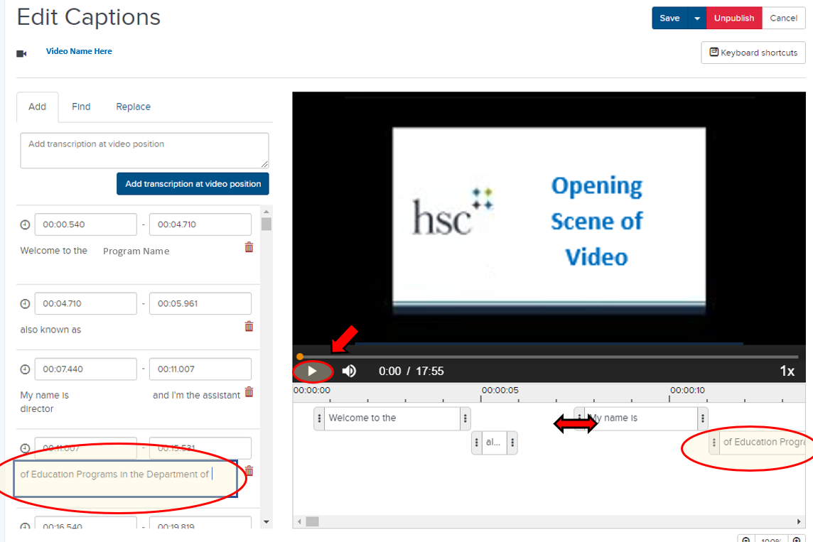 Important Note: You should make any desired edits to your Mediasite video before you create and add captions. Mediasite will not automatically edit or remove portions of existing captions. For example, if a video already has captions, and you edit the video to remove the first 30 seconds of content, the existing captions will remain unchanged, meaning the captions will run 30 seconds behind the edited video. Creating and adding closed captions should occur after your final edit.