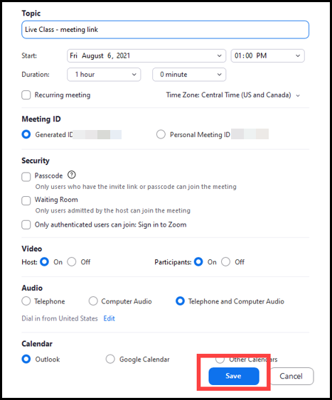 From your Zoom Desktop Client, select Schedule to schedule your Zoom meeting: