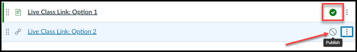 **Please note, the green checkmark indicates the item is Published for student view. The circle with a slash through it indicates the item is not Published for student view.**