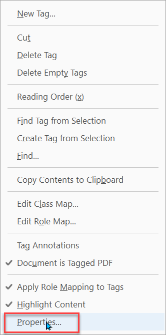 Within the Tags List, right click the <Figure> tag you want to add alternative text to. Choose the Properties option from the menu.