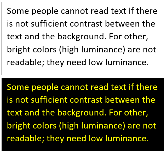 Contrast is a measure of the difference in perceived luminance or brightness between two colors, typically colors used between text and its background.